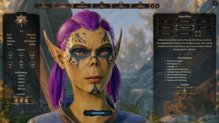 I was initially going to go with a Githyanki with purple hair for maximum contrast, but Larian's reference to giving us tails to play with is a clear indication that they think Tieflings are the most interesting, so whatever, I guess. Tieflings are 'planetouched' i.e. they are a bit descended from demons and so have cool horns and shit. There are other types of planetouched, including Aasimar, who are the same but for angels, and I hope they end up in the final release too. I digress: point is, our statistically interesting character will be a big horny pal.