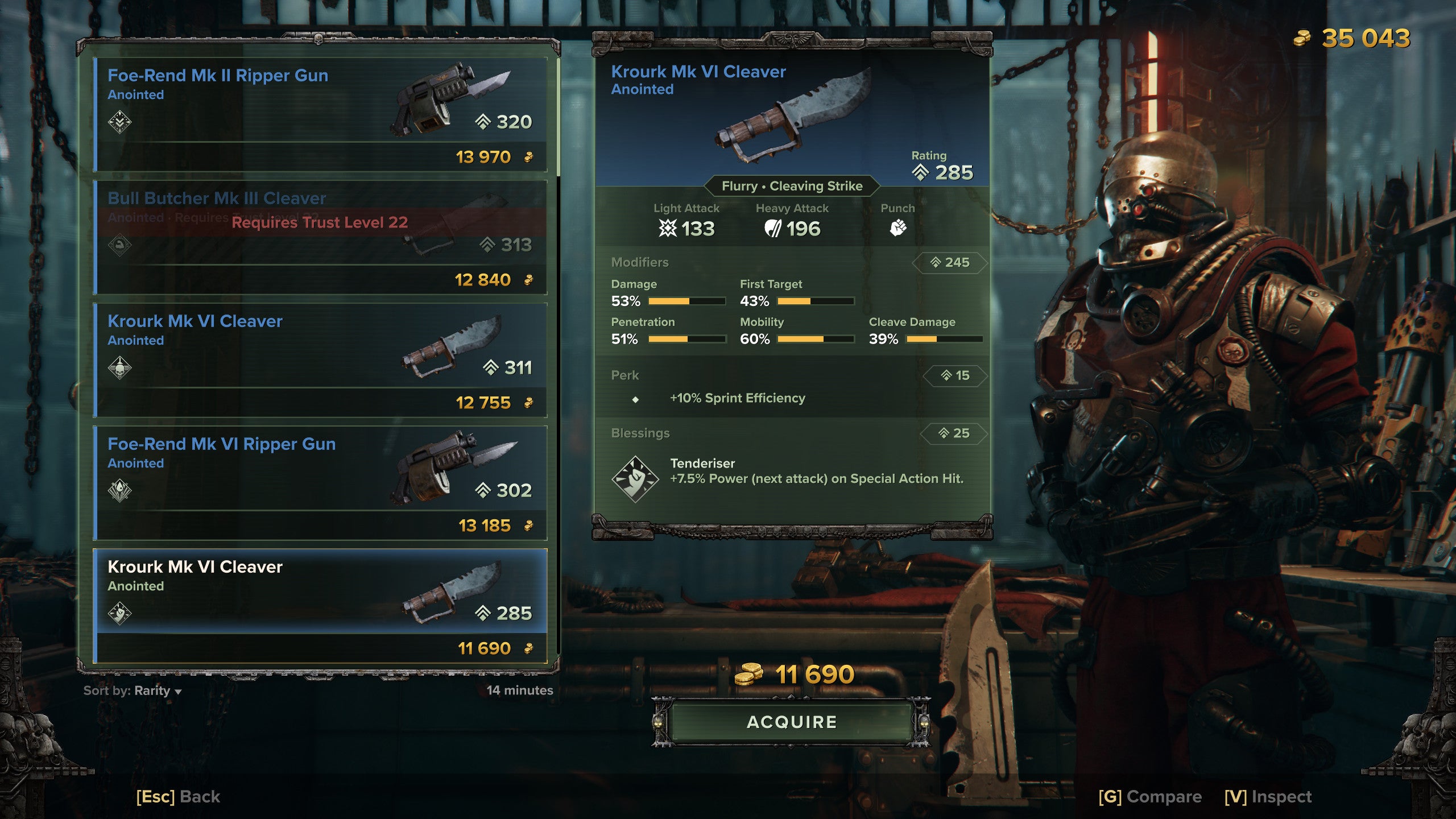 Here's the bit I suspect will eventually make me grow sick of Darktide: equipment. No weapon is just a weapon. They're all random rolls. Each comes with random perks and random rolls on stat from obvious functions like Damage and Ammo to esoteric attributes like Collateral. The practical difference between rolls is often minor and usually hazy. Even the weapon's Rating, a big number presented prominently on its card, is not a clear indicator of whether one is better than another. I often can't tell if I like a new roll on a weapon until I buy it, take it into a mission, and feel what those numbers actually mean.