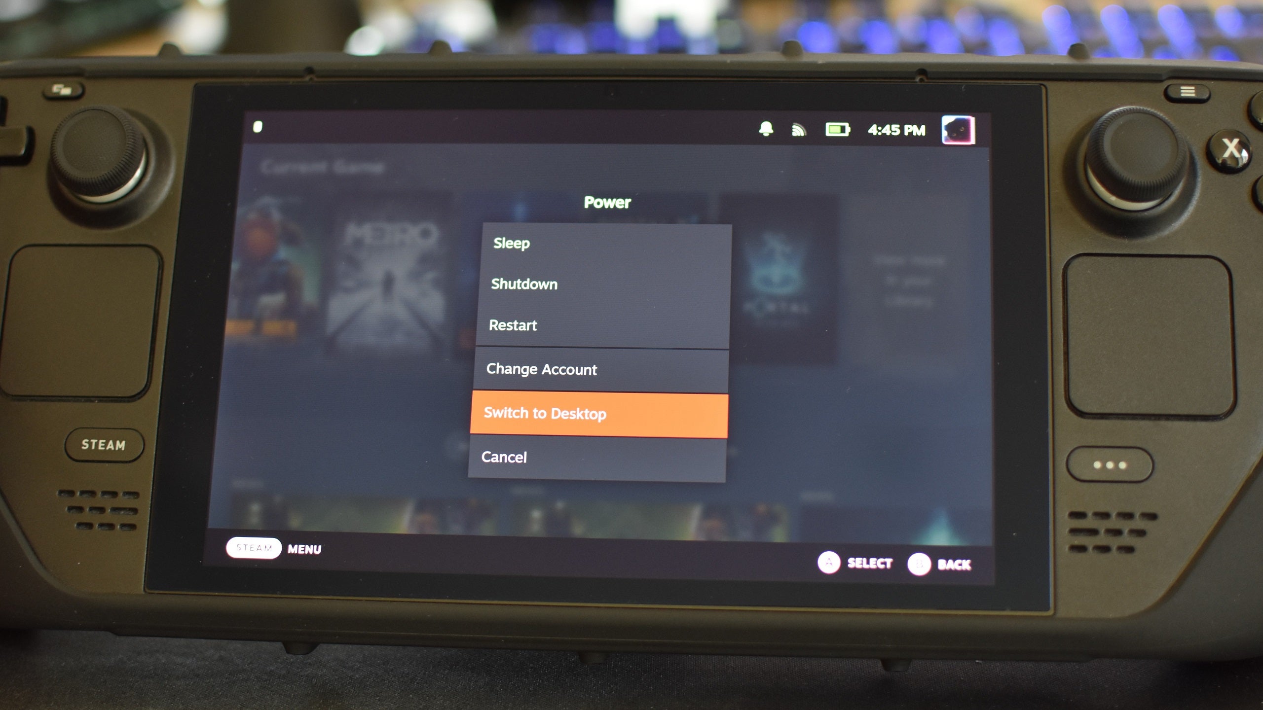 Step 1: Hold down the Steam Deck's power button and select "Switch to Desktop".