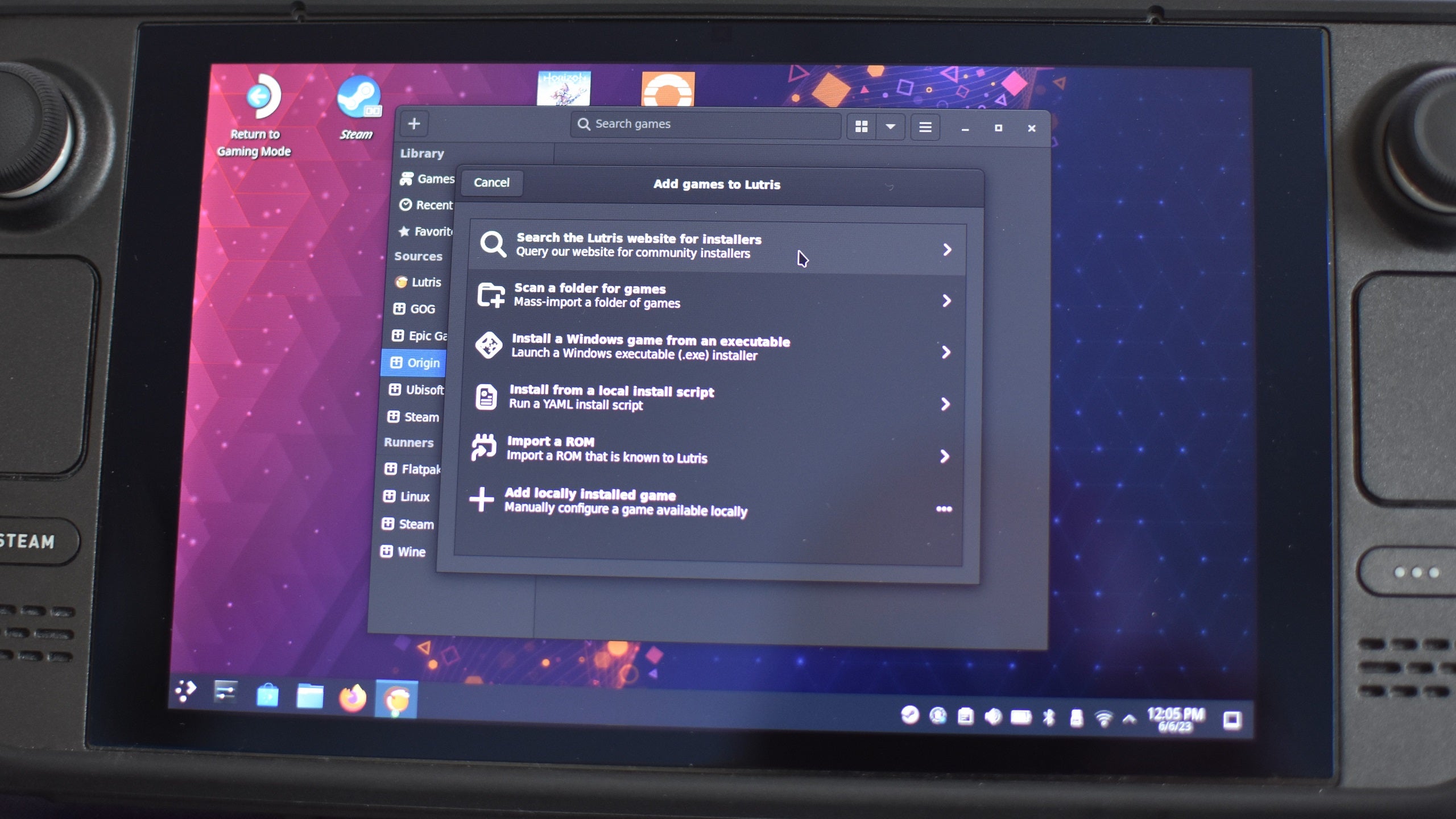 Step 10: Assuming you don’t want to go into Desktop mode every time you want to load up Lutris, the final step will be to add it as a non-Steam game. While still in Desktop mode, simply open Steam, click on "Games" at the top, then on "Add a Non-Steam Game to My Library". You should be able to find Lutris in the list of available apps, so select it and add it. Now, once you’ve returned to the Steam Deck’s Gaming mode, you can launch it easy peasy.