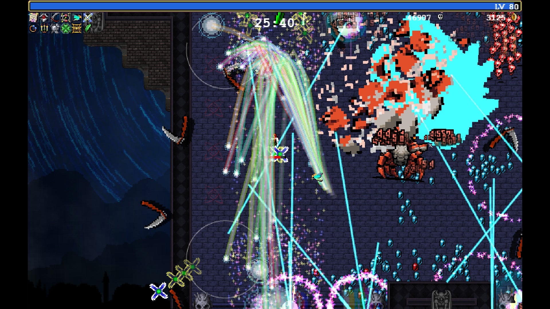There’s a very specific obstacle, in the form of a reaper who summons a field of blue bubbles at the five-minute mark that march up from the bottom of the screen, forcing me to move constantly upwards without a chance to collect the gems I need to grow powerful enough to deal with later waves. I can do damage to him, but so far not enough to kill him. I think the correct strategy involves swapping to item combinations I’m not so familiar with, but bypassing the bubble man will require experimentation and grit.