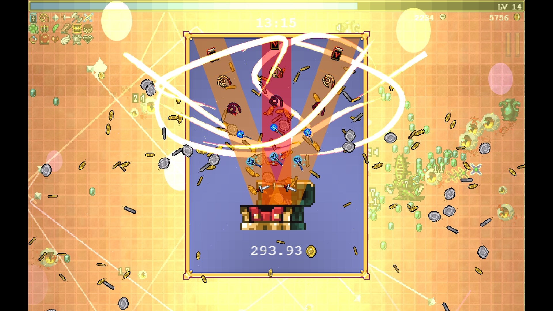 Most enemies drop gems when they die, which you can hoover up for XP and an oh-so-satisfying sound effect. It only takes a few minutes before that sound becomes a constant rush in your ears; the power curve is palpable. It still feels generous, with occasional explosions of potency sprinkled along the way thanks to either chests that contain five items at once rather than their regular one, or the way you occasionally get to randomly level up ten times in a row. Go on, Vampire Survivors says, sometimes. Who cares if you’ve earned it. The final level throws a curveball that turns that generosity on its head, but we’ll figure out how we feel about that later.